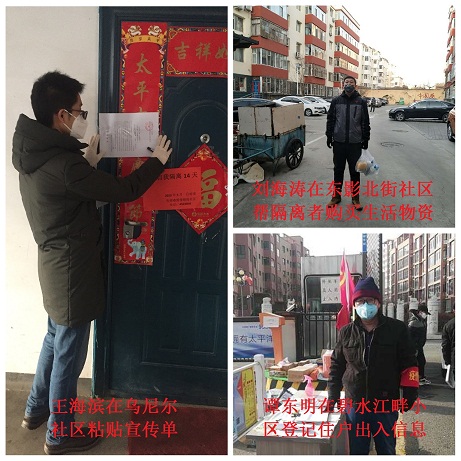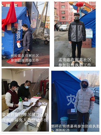 工程處入黨積極分子白文平、職工馬志強(qiáng)、曹明晴、成秀英、楊建剛是金城小區(qū)項(xiàng)目的工程師,疫情發(fā)生后,他們積極響應(yīng)公司號(hào)召到各自社區(qū)金城小區(qū)、橋靠社區(qū)、星河御園小區(qū)、廣廈小區(qū)、望興園小區(qū)參加疫情防護(hù)工作。他們?cè)诟髯苑揽匦〗M中,恪盡職守、站崗執(zhí)勤,每當(dāng)遇上大風(fēng)變天或值夜崗時(shí),值守人員都很難取暖,但為了有效防控疫情,他們克服困難自備棉服、把全部問(wèn)題都扛了下來(lái)。同時(shí)他們有的白天協(xié)助社區(qū)工作人員辦理登記、執(zhí)勤工作,晚上還要利用空余時(shí)間張貼宣傳單,默默的奉獻(xiàn)和堅(jiān)守又何嘗不是為群眾們?cè)偌右粚幼顝?qiáng)的防護(hù)網(wǎng)呢!
