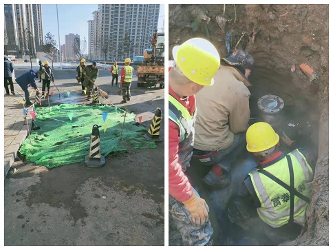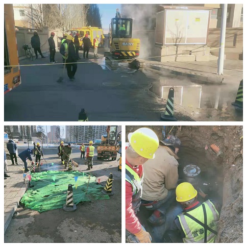 大年初二這天早上,富泰熱力公司巴彥分公司廠區(qū)門口路面滲水,疑似一次網(wǎng)發(fā)生跑水。得知這一情況后,分公司檢修所工作人員在對跑水位置進行初步判斷后,立即聯(lián)系了安裝分公司。嚴陣以待的安裝分公司搶修隊員第一時間趕往現(xiàn)場,發(fā)現(xiàn)現(xiàn)場有配電箱,地下有電纜、天然氣管,機械開挖比較危險,于是人工對路面進行開挖,進一步尋找漏點。經(jīng)過查找,發(fā)現(xiàn)是一次網(wǎng)上一個50抽頭發(fā)生跑水,他們不顧刺骨寒風帶水作業(yè),給抽頭焊接了一個150的套管,又在套管上安裝了一個150的法蘭球閥,等做好保溫回填地面后,已經(jīng)是第二天凌晨4點了。大年初五,安裝分公司又接到了左右城小區(qū)跑水搶修任務。由于施工難度較大,搶修隊員們一刻不停歇的干了一天才完成任務,及時恢復了供暖。