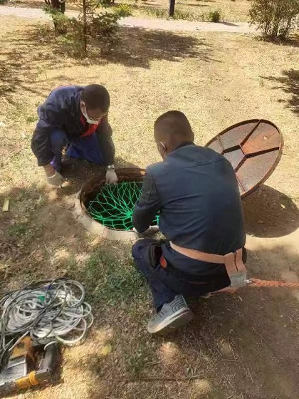 安裝現(xiàn)場(chǎng),工作人員打開(kāi)井蓋通風(fēng),在用氣體檢測(cè)儀檢測(cè)井內(nèi)的氣體符合作業(yè)條件后,工作人員綁好安全帶用電鉆在井壁上鉆孔,釘入尾端帶鉤的膨脹螺栓,擰緊固定后將防墜網(wǎng)掛到掛鉤上,一張防墜網(wǎng)就安裝完成。現(xiàn)場(chǎng)工程師傅每完成一個(gè)防墜網(wǎng)的安裝,在確保安全的情況下,都會(huì)親身踩試檢驗(yàn),確保安裝牢固。