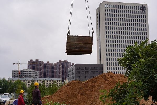 9月24日上午,筆者遠遠看到一吊車正將坑內挖掘的土方吊起,走近作業(yè)坑,看到坑內小型挖掘機正在開挖土方,還有2名施工人員正在進行鋼筋網片的焊接。