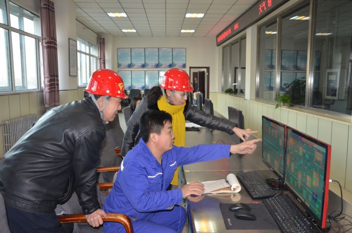 城發(fā)公司董事長張瑞平在橋靠司爐車間給環(huán)保局領(lǐng)導(dǎo)講解脫硫情況